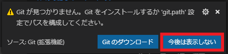 なお、Windows の VS Code で clone した Git リポジトリを開くと、「Git が見つかりません」というエラーが表示されることがあります。
