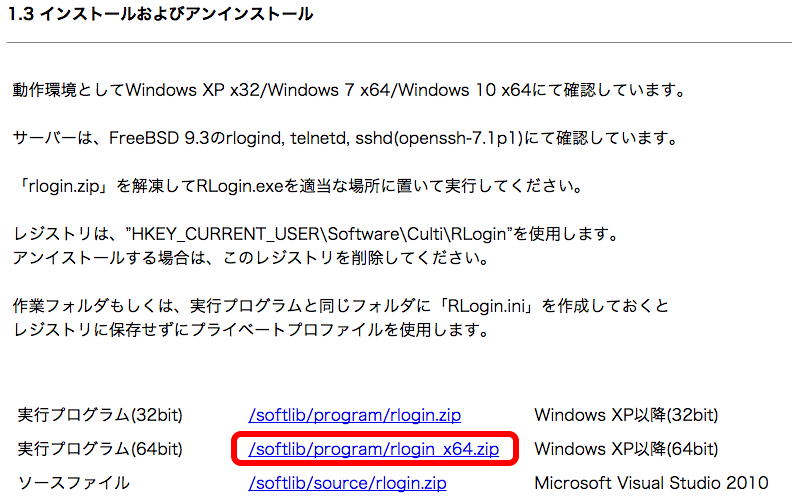 Windows の場合は、Google などの検索サイトで「rlogin」と検索し、結果から、rlogin/telnet/ssh(クライアント)ターミナルソフト というサイトにアクセスし、「1.3 インストールおよびアンインストール」とある辺りのリンクから、/softlib/program/rlogin_x64.zip という zip ファイルをダウンロードします。